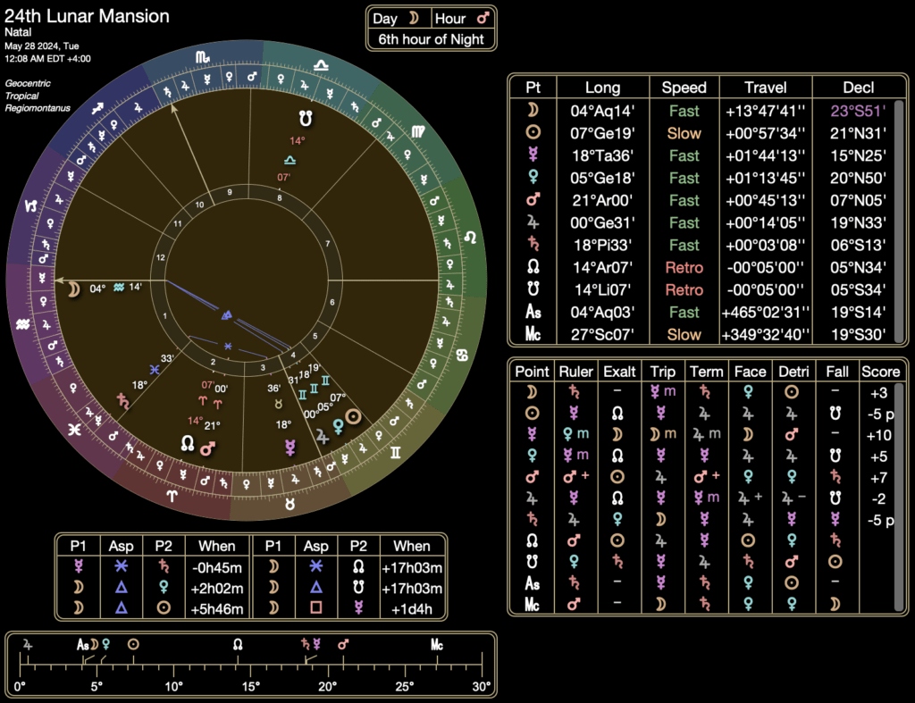Overall this is a fairly straightforward magical election. The only noteworthy weakness is one we remarked on above, namely that the Moon is making an aspect to an afflicted planet (combust Venus). We note for completeness that some mages consider the Moon on the Ascendant to be an affliction based on a passage from Picatrix. However, we emphasize that both Picatrix and De Quindecim Stellis list copious electional recipes that include the Moon rising on the Ascendant, and we therefore conclude based on the conflicting information and our own experience that the tradition clearly licenses proceeding with astromagical elections that include this condition when divination supports doing so.