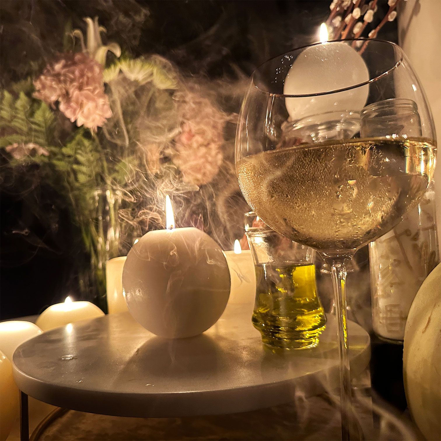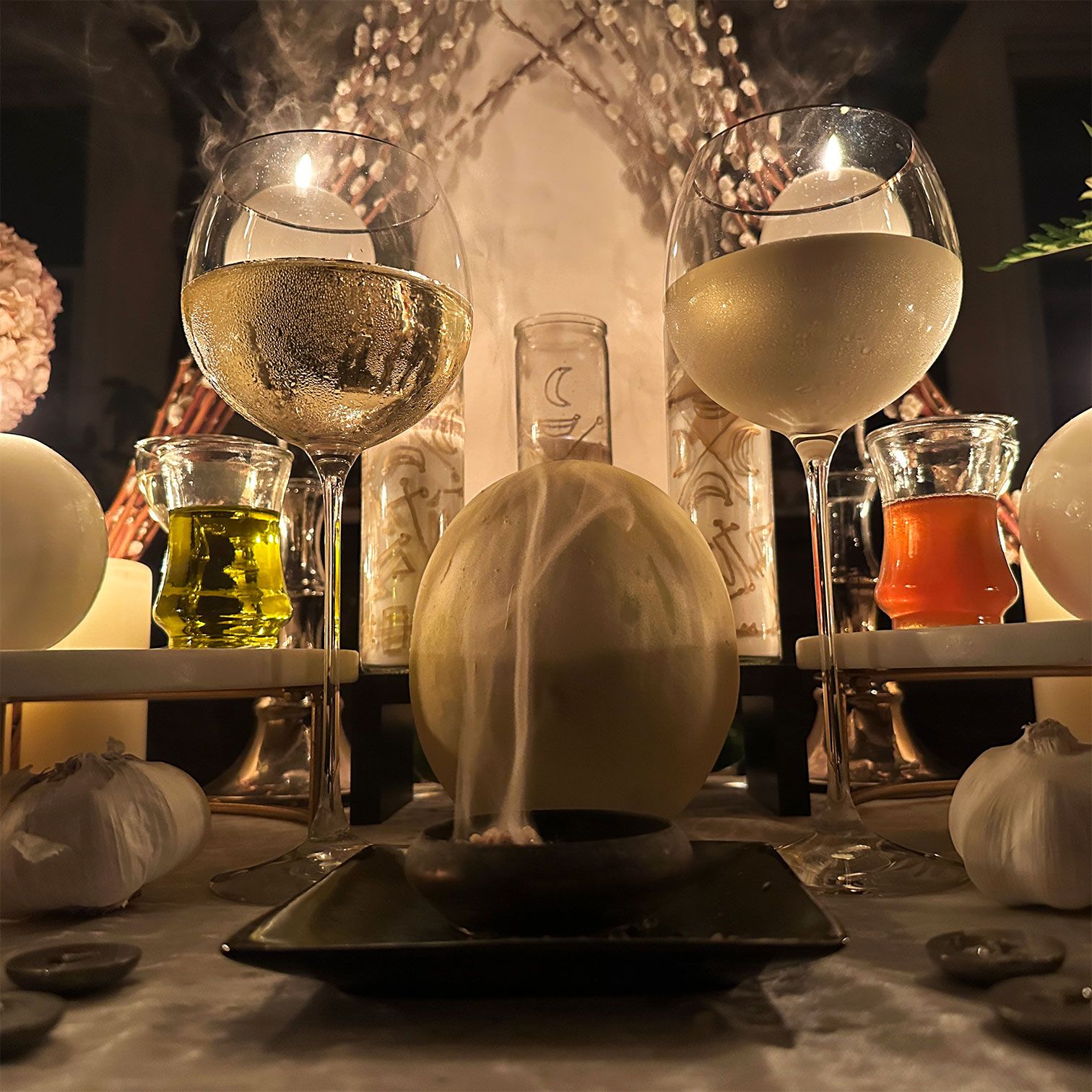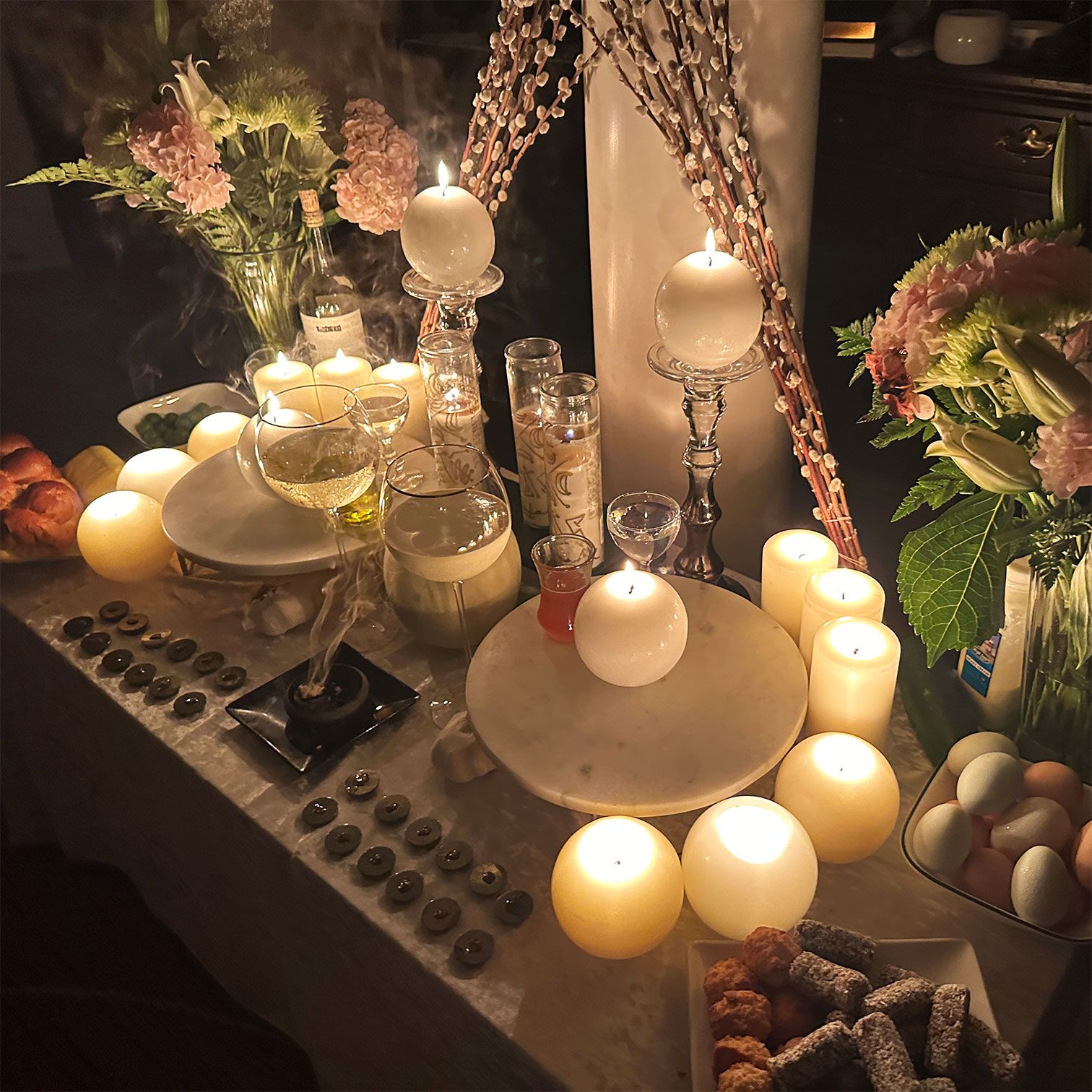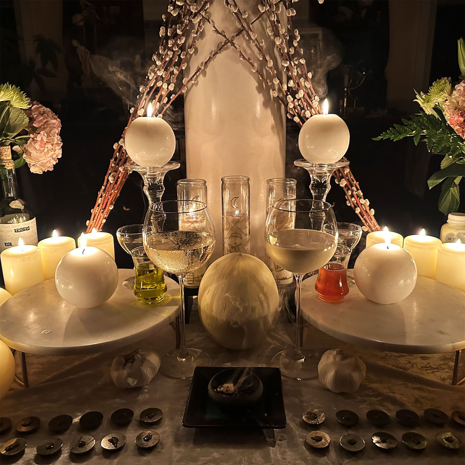 An altar spangled with white and silver was erected prior to the working, with offerings made to Zahledo, angel of the 24th Lunar Mansion, of food, spirits, fresh flowers, and two willow branches. Many white candles provided illumination for the ritual, as well as three candles ritually prepared and emblazoned with sigils and the kamea of the Moon.