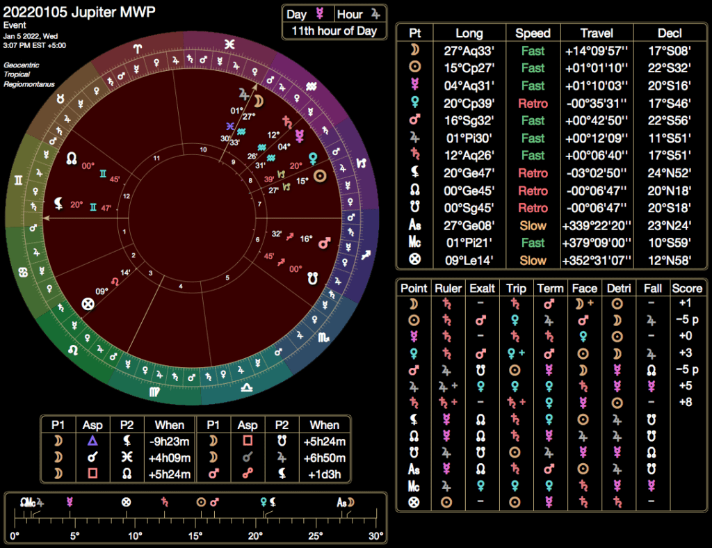 In terms of the essential and big picture factors, this is an excellent magical election. Down in some minor details, we can see that the Ascendant and the Moon were in the later degrees of their sign at the outset of the election and in the terms of Mars. The Moon’s dignity somewhat makes up for this minor indignity, but in a perfect world we would like to evacuate any malefic influence from a benefic election. Also, the Moon and Jupiter were at the bendings of the nodes. This has not been a significant affliction in our own magic so far as we have been able to tell, but if you are sensitive to such matters, we highlight this just in case.